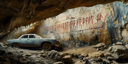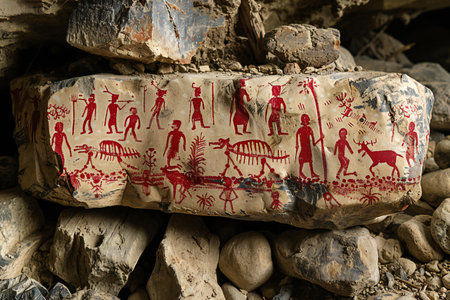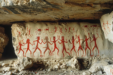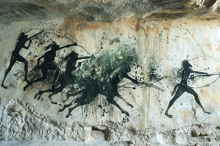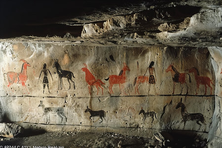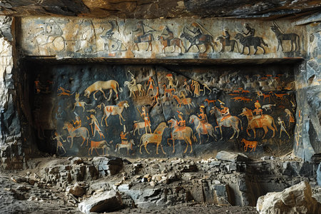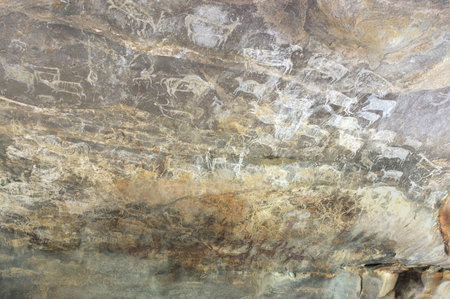 Ancient cave paintings on the wall of a cave in the mountains.