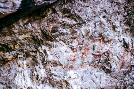 View inside the ancient cave with stone walls with additional lighting. Texture of a stone wall in a cave. Akhshtyr cave, Sochi, Russia
