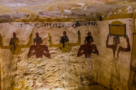 BAWITI, EGYPT - FEBRUARY 5, 2019: Wall painitngs in the Zed Amun Ef Ankh Tomb in Bahariya oasis, Egypt
