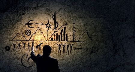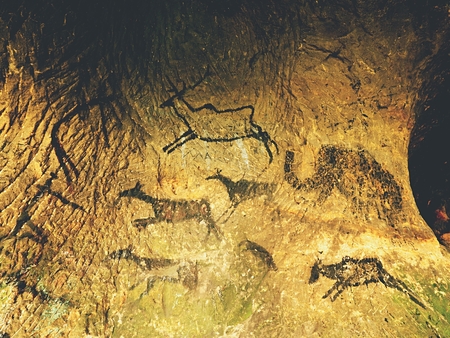 Paint of human hunting of deers, mammoth and reindeer. Historical black carbon abstract art in sandstone cave in poor light. Discovery of prehistoric paint of caveman hunt in sandstone cave.