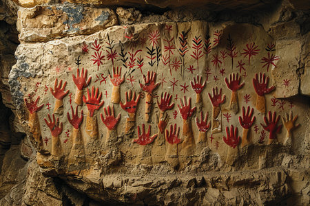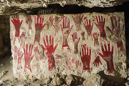 Hands of an ancient caveman with red prints on the walls