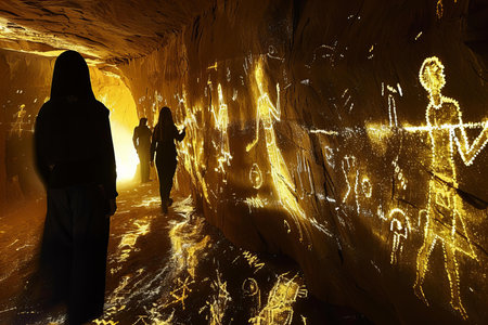 Silhouette of people in a cave with glowing light.