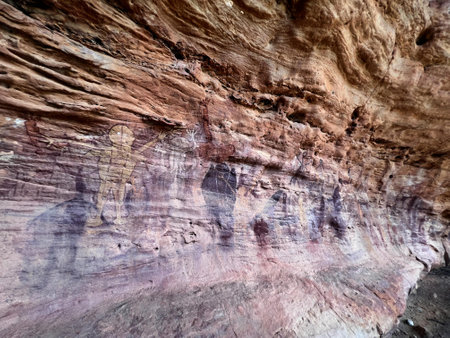 CAPE YORK, QLD - JUNE 21 2023:Indigenous Australian rock art paintings on Split Rock Laura in Cape York peninsula Queensland, Australia.Rock art is an integral part of First Nations life and customs.