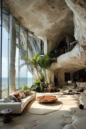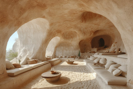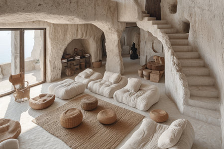 Discover the tranquil beauty of a cave interior featuring soft furnishings, an inviting lounge space, and natural light enhancing the serene atmosphere.