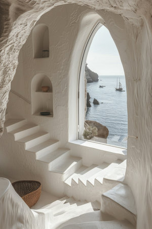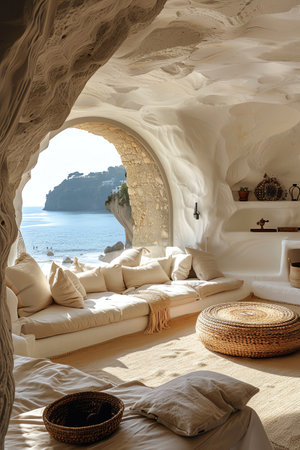 Bright cave living room with cushions, sea view through arched window, soft lighting