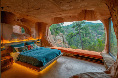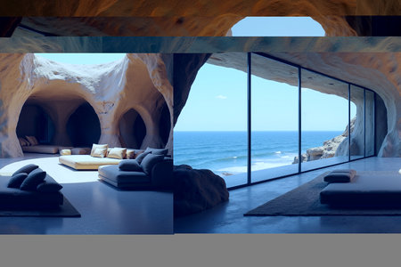 A serene cave bedroom featuring a comfortable bed, natural textures, and a breathtaking view of the sea. Generative AI