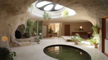 This modern living space features a cave-like structure with rounded walls and a skylight allowing natural light to stream in