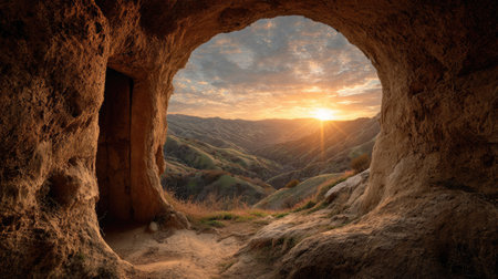 An image showcases a cave opening framing a distant landscape. The scene depicts rolling hills under a vibrant sunset with warm light. The composition features rich textures and colors of the natural environment, suitable for various editorial and commercial applications.