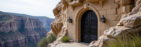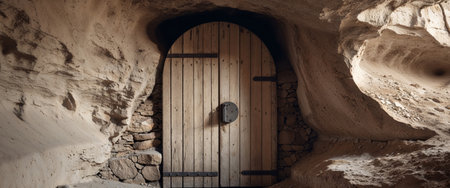 AI Generated. Wooden door with metal handle in cave resembling ancient stone doorway