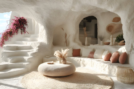 Beautiful mediterranean cave interior showcasing rustic decor elements. features include a round woven rug, natural textures, a cozy seating area, earthen pots, and cascading pink flowers, all bathed in natural light for a serene atmosphere. Generative AI