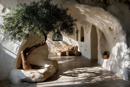 A beautifully designed rustic interior featuring a sunlit olive tree growing from the stone floor. the arched cave-like walls and wicker furniture create a serene, mediterranean atmosphere perfect for relaxation. Generative AI