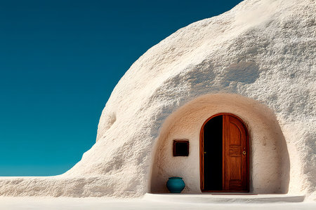 Mediterranean Architecture: Minimalist White Adobe House with Wooden Door Generative AI