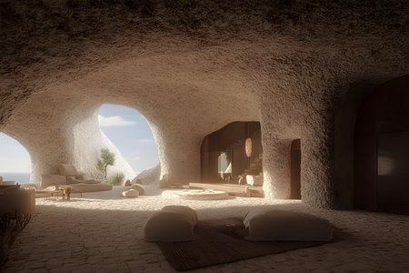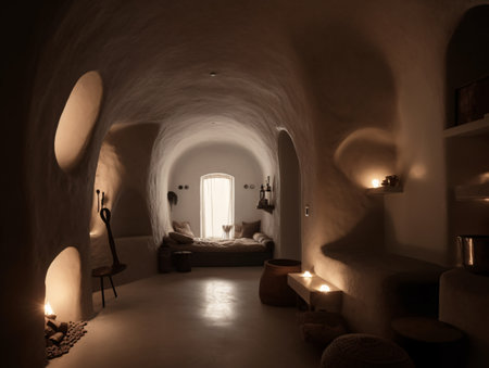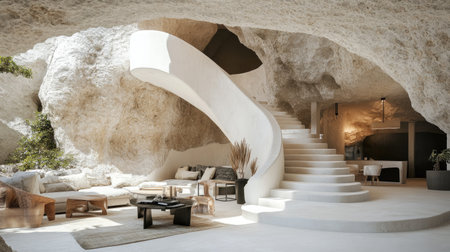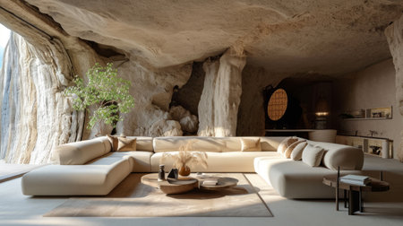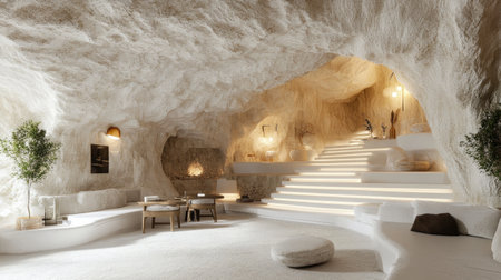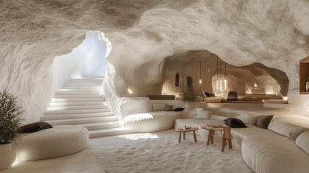 Discover a serene cave interior that combines modern design with natural elements, creating a cozy and inviting living space filled with soft lighting and textures.