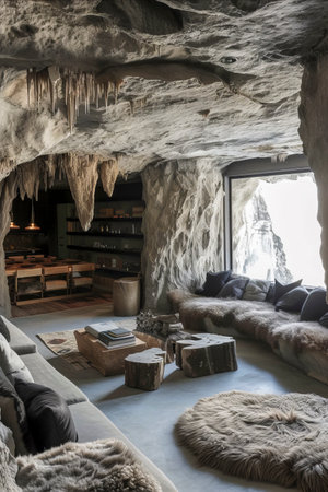 unique, cozy living space within a cave-like setting, blending natural stone walls with modern furniture