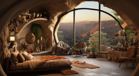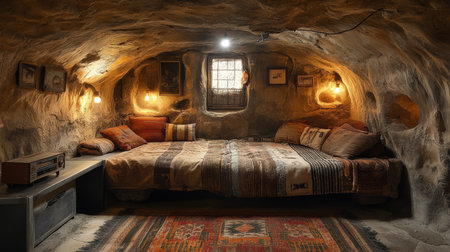 Unique underground cave bedroom with rustic decor and warm lighting designed for cozy living. Generative AI