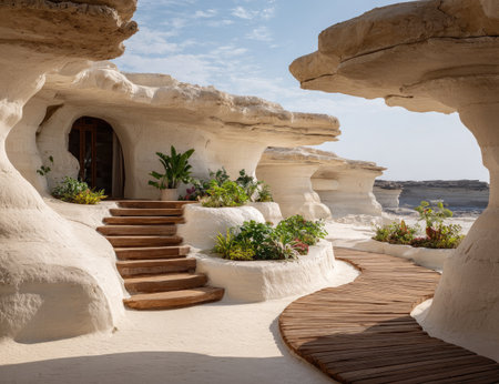 Winding wooden pathway meanders through a landscape of sculpted, light beige rock formations. The pathway is flanked by plants in decorative planters, and a set of stairs leads to a sheltered entrance. Sunlight illuminates the scene.