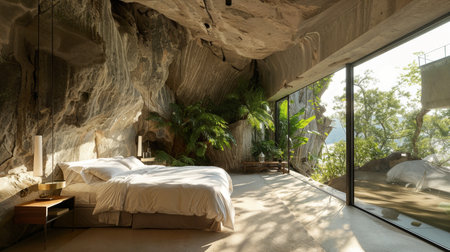 Unique bedroom carved into a cliffside cave, featuring black stone walls, contemporary furnishings, and lush greenery, blending nature with modern luxury.