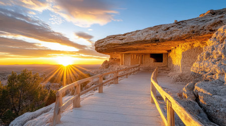 A stunning sunset illuminating ancient ruins with wooden pathway
