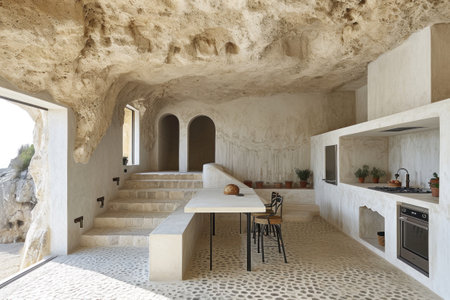 A kitchen and dining area in a cave-like home with stone walls, AI