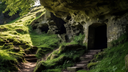 the cliff house, located in the forest of golgotha castle wall, larnerholm castle, is captured in this uhd image. the photo showcases the mystical fantasy atmosphere with the orton effect, highlighting the passage of light through the bronze and green hues. it evokes a sense of literary excavations and traditional british landscapes. ai generated