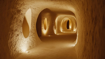 This captivating image showcases a tranquil underground passage lined with soft lighting, highlighting the unique archways in a natural cave space.