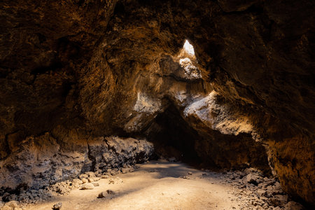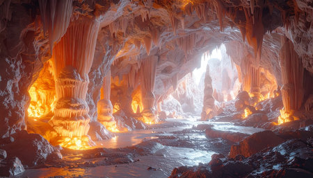 Discover the enchanting interior of a mysterious cave, featuring dramatic lighting and fascinating rock formations that create an atmosphere of intrigue and exploration.