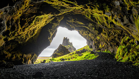 From within a dark, moss-covered cave, a striking rock formation stands tall in a bright, green valley.