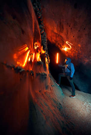 Tourist man holding red glow lamp in deep narrow glacial ice cave with explore winter mountain glacier in Kazakhstan