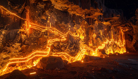 A winding pathway, illuminated by a warm, fiery glow, leads adventurers deep into the heart of a mysterious underground cavern. The lights trace the natural contours of the ancient rock, revealing a hidden world of geological wonders and inviting a journey into the unknown.