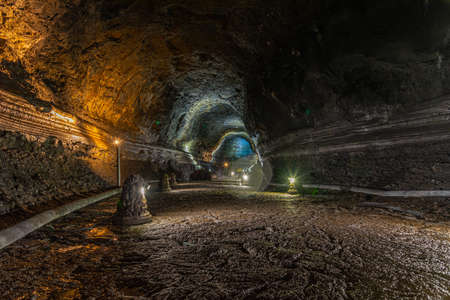 Beautiful cave. View from inside dark dungeon. Textured walls of cave. Background image of underground tunnel. Dampness inside cave. Lighting inside cave for excursions.