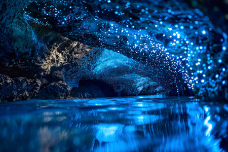 Glowing bioluminescent algae light up the dark waters of a mysterious cave.