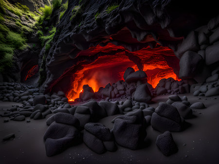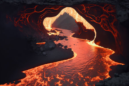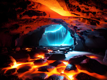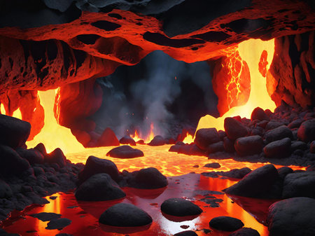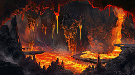 Jhfgdnew showing fiery lava flowing into a cavernous underground chamber with stalactites and stalagmites keywords: lava, volcano, fire, magma,...