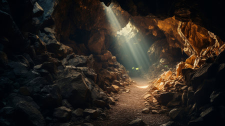 An AI generated illustration of an open cave illuminated by a vibrant, golden sun
