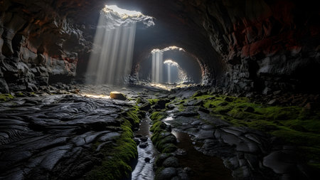 Dramatic beams of sunlight filter through openings in the ceiling of a dark lava tube cave, illuminating the mossy, rocky floor below. The atmospheric lighting highlights the rugged texture of the cavern walls and the subterranean environment.