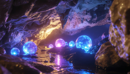 Mystical glowing orbs illuminating a dark, water-filled cave with rocky formations and reflections