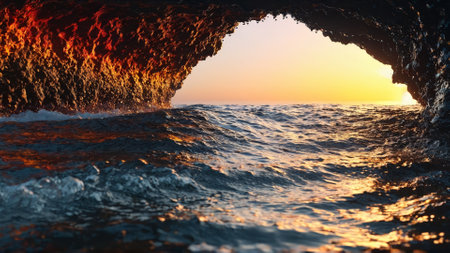Stunning coastal cave bathed in ethereal sunset glow with the ocean waves crashing against the rugged craggy rocks and cliffs A breathtaking natural wonder of geology and light