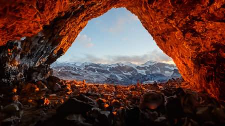 Rocky cave interior with sunlight pouring through the entrance, realistic style, mountain landscape in background, concept of discovery and wonder