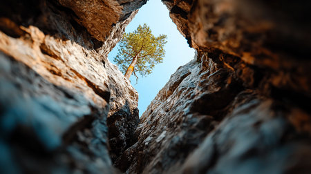 A vibrant green pine tree, with a textured trunk, reaches towards the sky, framed by rough, brown rock formations.