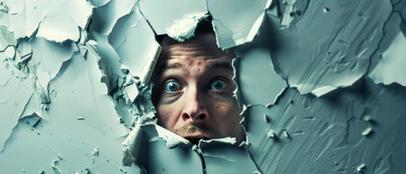 A man's face is peeking through a cracked wall. He has a surprised and fearful expression. The wall is old and has peeling paint, highlighting the contrast between the man's fear and the aged background.