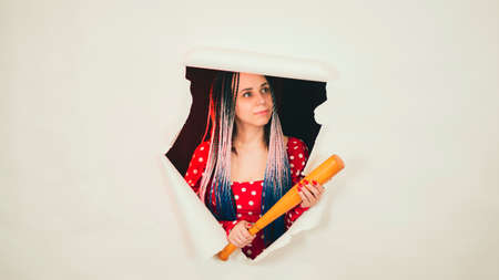 Young woman with baseball bat in hole of white background. Pretty lady with bat