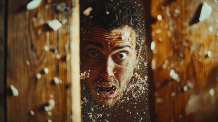 A man head emerges from a broken wooden plank, shock frozen on his face, high-definition details, fine dust floating around.