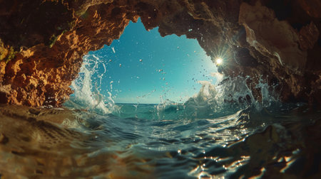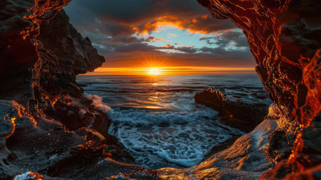 Stunning sunset framed by the sea's wave hole, captured from a distant perspective, showcasing the natural beauty and vibrant colors