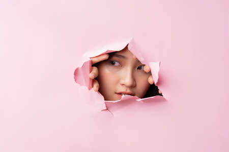Red color paper with a ripped hole and watching eye from it, the concept of rumors and peeping. Funny picture of a woman's eye looking for interesting projects.