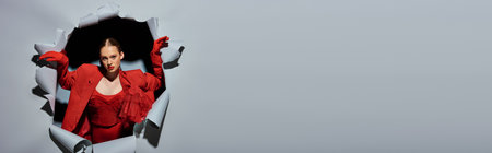 trendy young woman in red attire with bold makeup breaking through grey background with hole, banner