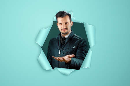 Man face and head sticking out and looking through a hole in brown paper. Hands pushing the paper aside. Studio portrait.