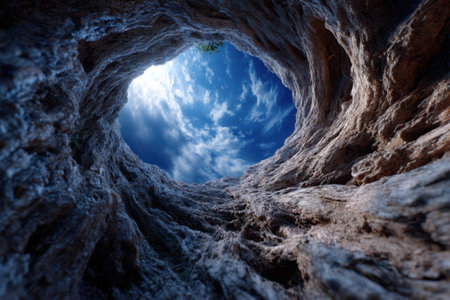 Perspective from within a cave reveals bright sky and soft clouds above this natural formation.