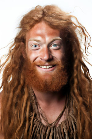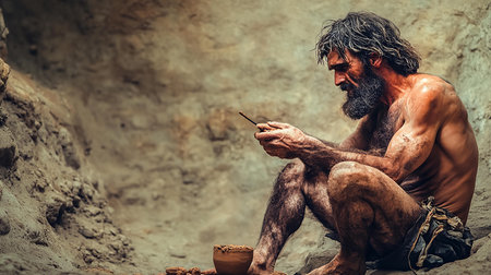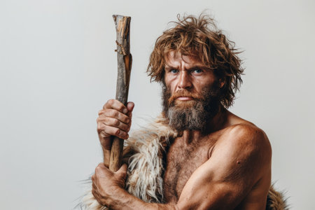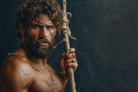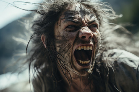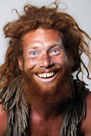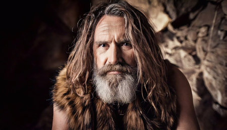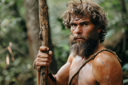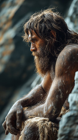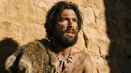 Shaggy-haired man with rugged face, intense expression, and earthy attire, evoking a prehistoric vibe. Dirt smeared across skin enhances the raw, primal appearance of the subject