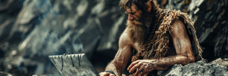 Ancient Stone Age Programmer, Prehistoric Programming, Neanderthal Man Working on Stone Computer, Generative AI Illustration
