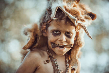 Wild funny boy portrait. Little caveman with bone in mouth. Prehistoric tribal boy outdoors on nature. Young shaggy and dirty savage, warrior and hunter face. Primitive ice age man in animal skin close-up.