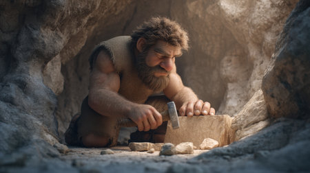 A realistic portrayal of a caveman artist carving stone within a cave, highlighting early human creativity and craftsmanship in a primitive setting.